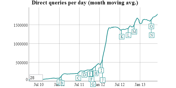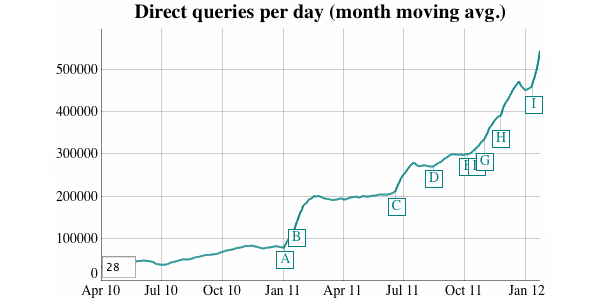 En enero de 2012 en SerchEngineLand comentaban que llegaba a superar las 500.000 consultas al buscador.