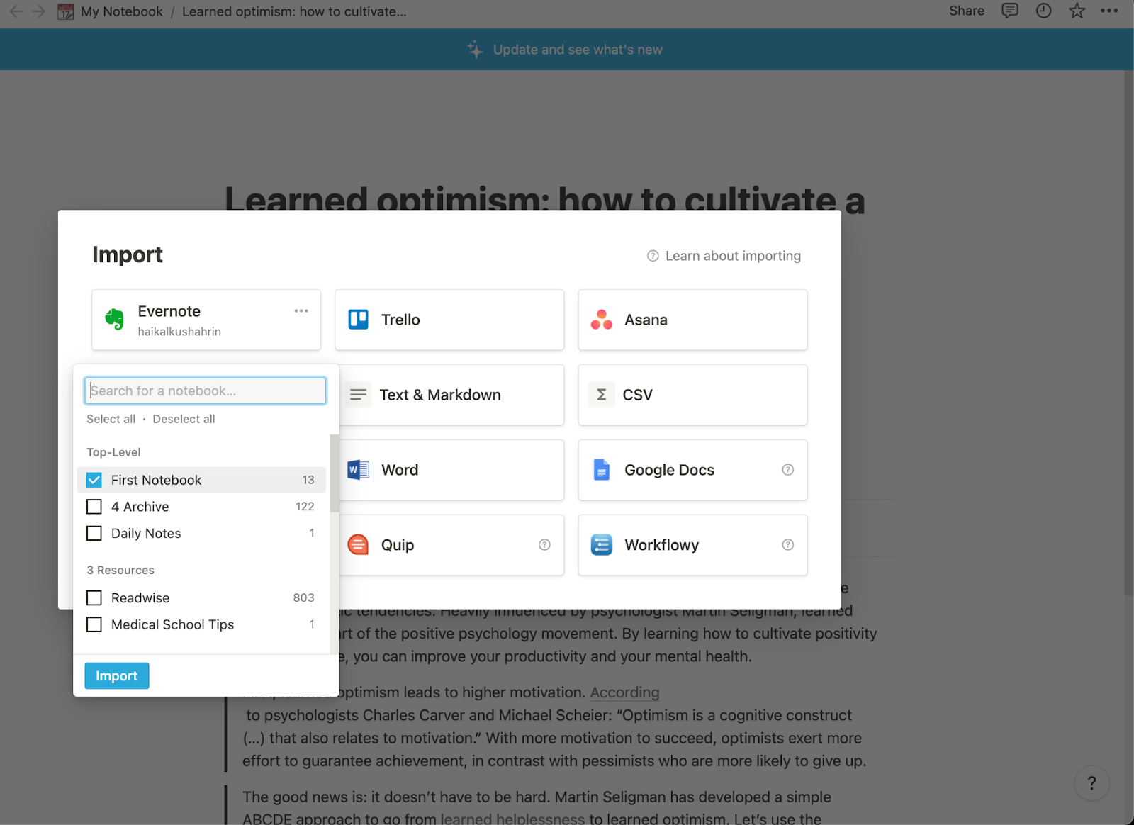 Puedes importar todas las libretas de Evernote, con sus notas, tags, e imágenes incluidas. Tanto cada libreta como cada nota de Evernote se convertirán en Páginas de Notion. También puedes elegir si quieres importar todo, o solamente importar una libreta de Evernote en concreto.